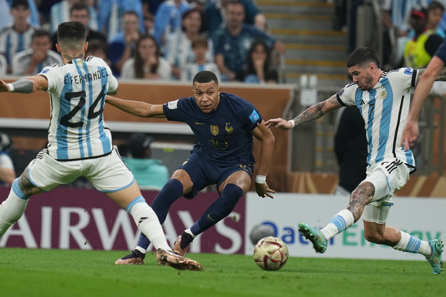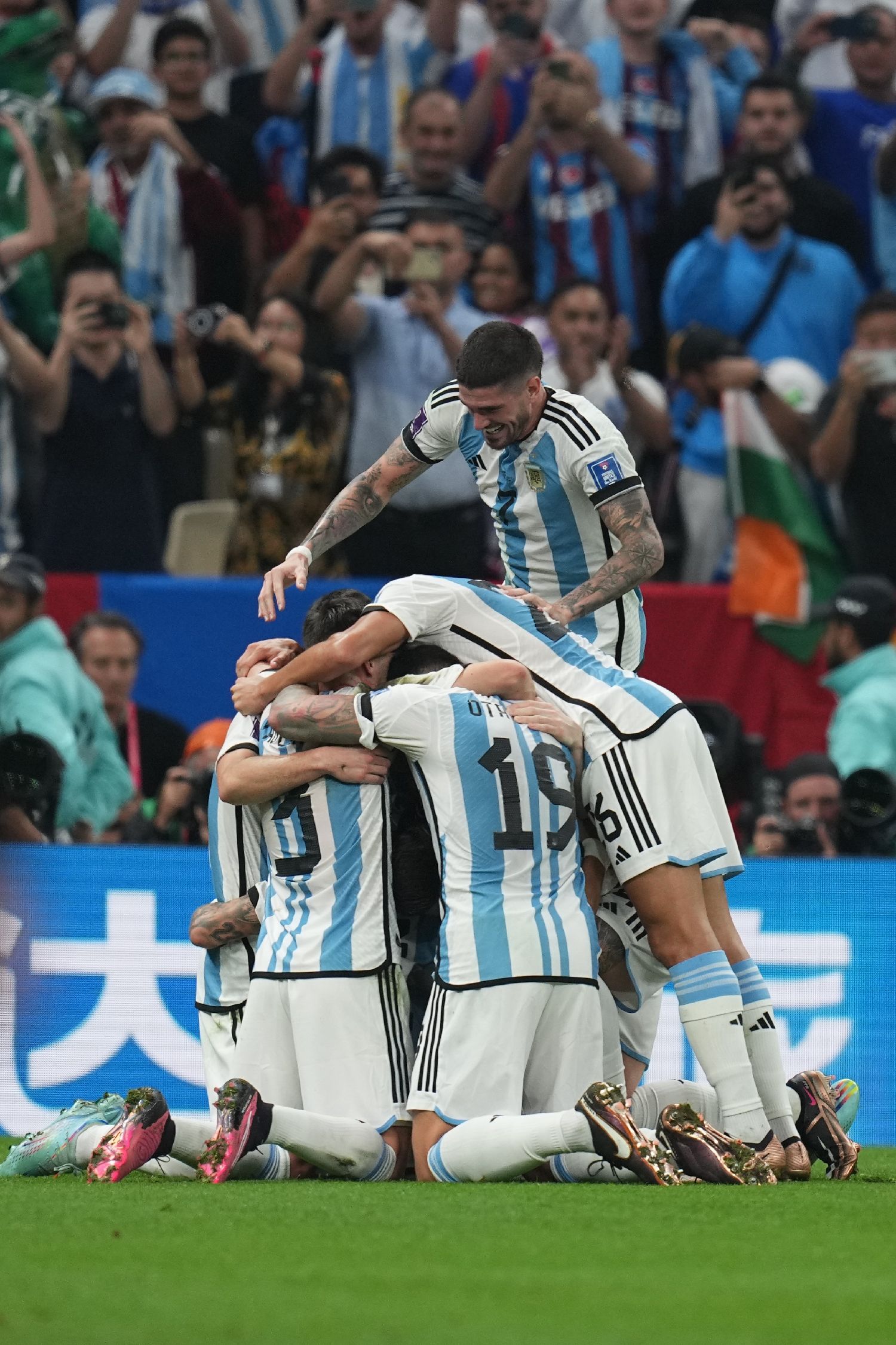 当地时间12月18日,2022卡塔尔世界杯足球赛决赛在卢赛尔球场进行。阿根廷队通过点球大战7:5力克卫冕冠军法国队(常规时间两队2:2战平,加时赛1:1战平)用一种最“惊心动魄”的方式赢得大力神杯。