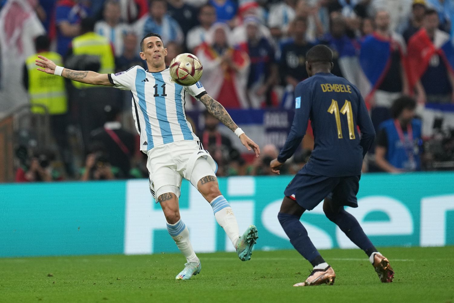 阿根廷队球员迪马利亚(左)和法国队球员登贝莱在比赛中。(中新社)