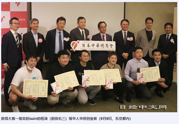 图为获得大赛一等奖的issin的程涛(前排右三)等华侨华人创业者合影。(图/日经中文网站截图)