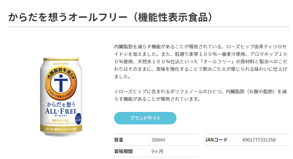 图为“ALL-FREE”的另一款产品,可以减少内脏脂肪的无酒精啤酒。(图/三得利官网截图)