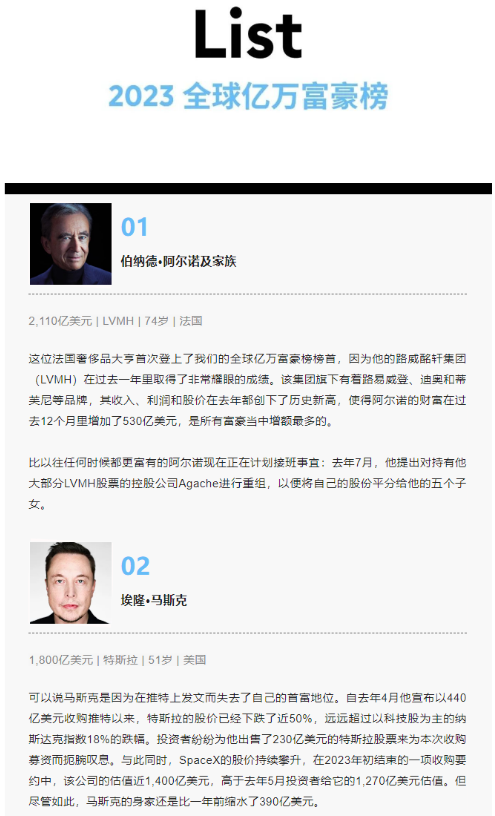 2022年10月以440亿美元收购推特公司,随后又遭遇特斯拉股价暴跌的埃隆·马斯克个人财富下跌了18%,降至1800亿美元,这一变动使来自法国的LVMH(酩悦·轩尼诗-路易·威登集团)总裁伯纳德·阿尔诺成为今年的新全球首富。本榜单中,亚马逊创始人杰夫·贝索斯位列榜单第三位;微软公司联合创始人比尔·盖茨位列第六。
