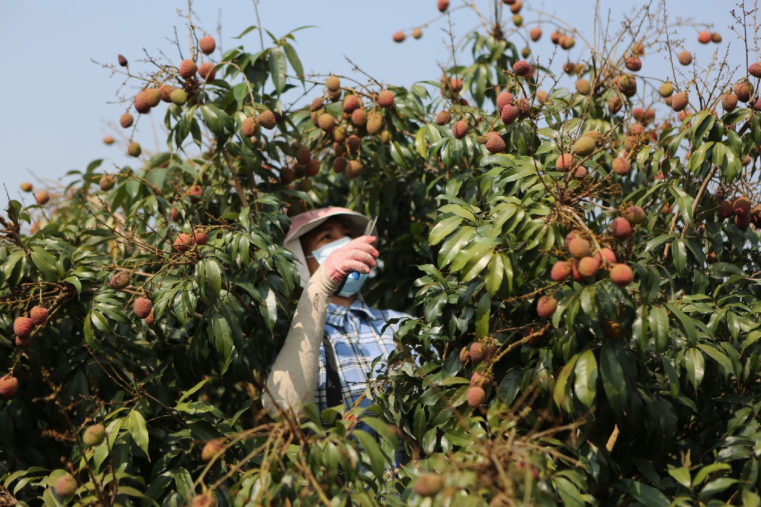 3月12日,农户在海南乐东黎族自治县万冲镇友谊村内的荔枝基地采摘荔枝。(图/新华社)