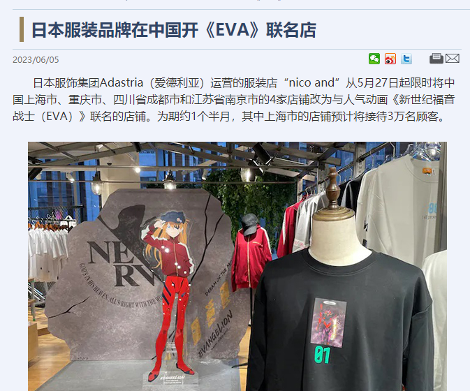 日经中文网6日报道,日本服饰集团Adastria(爱德利亚)运营的服装店“nico and”从5月27日起限时将上海、重庆、成都和南京的4家店铺改为与人气动画《新世纪福音战士(EVA)》联名的店铺。为期约1个半月,其中上海市的店铺预计将接待3万名顾客。