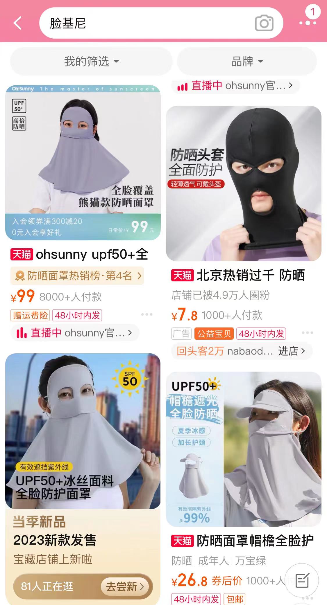 不少商家表示,他们今年明显感觉到消费者对脸部防晒更加重视。为此,他们推出了多款防晒面罩。比如上面这种“武装到脖子”的“脸基尼”,还有渐变的“腮红口罩”都是销售爆款。