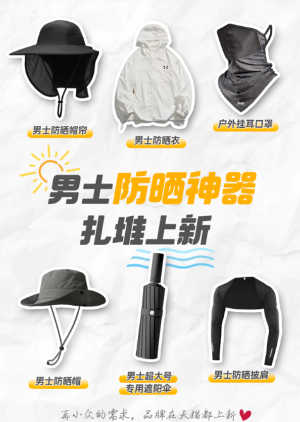 今年6月,天猫平台上男士的防晒装备销量同比大幅增长,其中购买防晒衣的男生比去年多了1倍。防晒市场涌现新的机会,嗅觉灵敏的品牌们纷纷推出,男士防晒衣、防晒渔夫帽、男士超大号防晒伞、户外挂耳护颈口罩等新品,新品数量同比增长两倍。