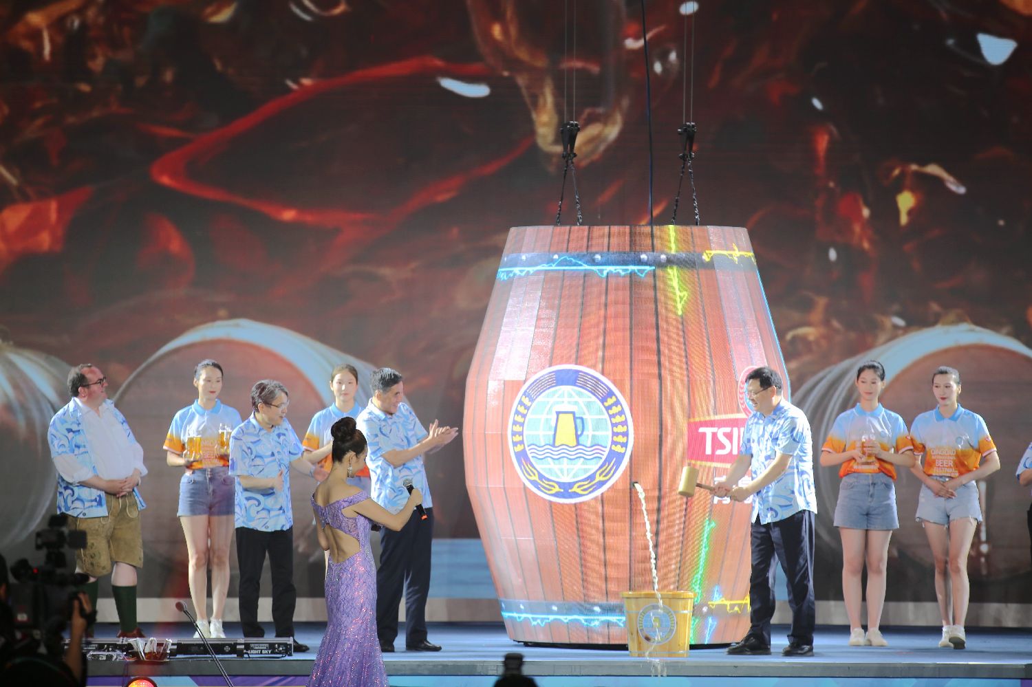 海内外嘉宾共同开启第33届青岛国际啤酒节第一桶啤酒。(图/中新社)