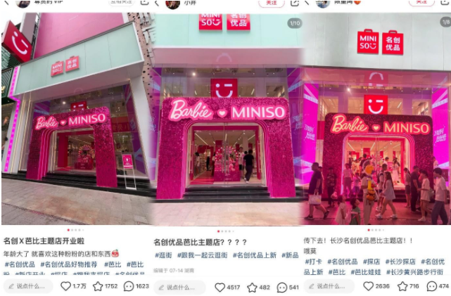 而名创优品长沙城市形象店甚至在新品上线时换上了梦幻芭比粉“外衣”,店外还落地巨型名创优品芭比粉色杂志创意装置,不但一举成为了长沙的新晋网红地标,还成为了社交平台的流量密码,在某书上发布与芭比主题店有关的笔记,流量都会翻几番,不少网民都在评论区喊话名创优品到自己的城市开主题店。