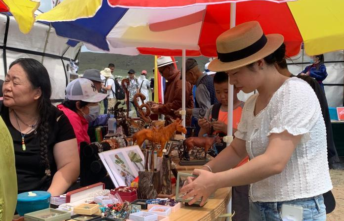 图为游客们正在那达慕会场的商品展上选购伴手礼。(图/中新网)