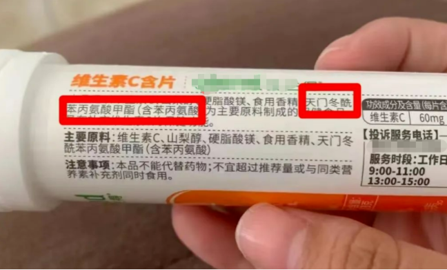 图为消费者在购买的维生素C发现了天门冬酰苯丙氨酸甲酯,也就是阿斯巴甜的学术名字。(图/武汉九派新闻)