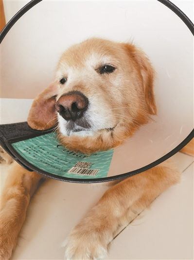 耳朵血肿手术后康复中的金毛。(图/《广州日报》)