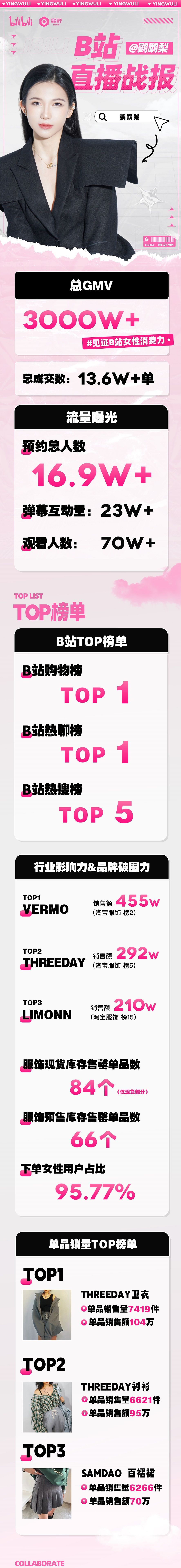 本次UP主“鹦鹉梨”直播以服饰为主个护为辅,预约总人数超16.9万,弹幕互动量超23万,观看人数超70万。同时,本次直播也成为当日B站购物榜TOP1,B站热聊榜TOP1,B站热搜榜TOP5。