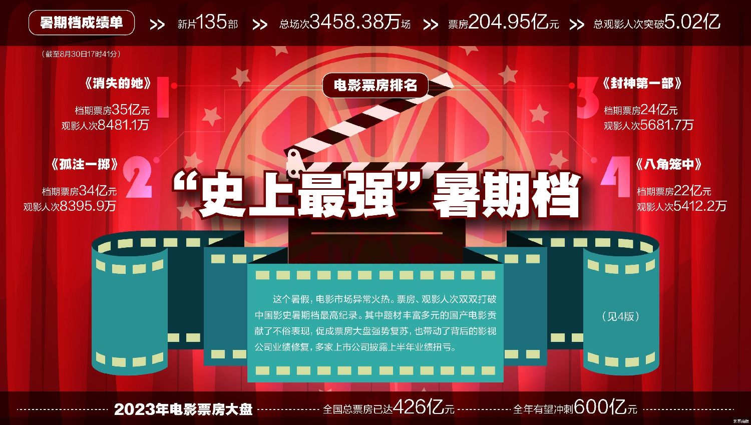 今年暑期档整体呈现“爆款频出”“百花齐放”的盛况。具体票房方面,电影《消失的她》《孤注一掷》《封神第一部》分别以35亿元、34亿元、24亿元的票房成绩暂列档期电影票房前三名。共4部影片票房超过20亿元,数量上为历史最多。