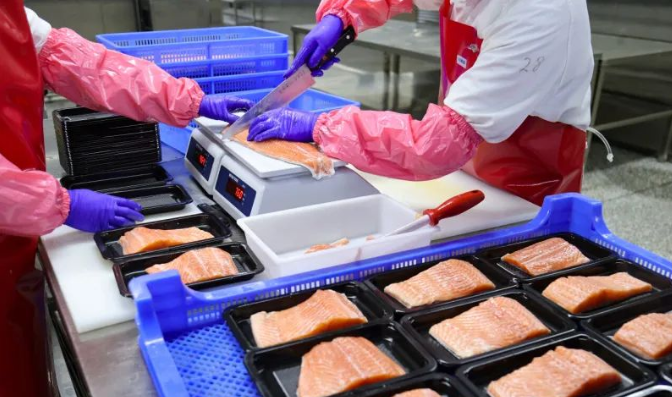 图为2月16日,在新疆鳟贵鲜食科技有限公司加工车间,工作人员正在切割三文鱼。(图/济南海报新闻)