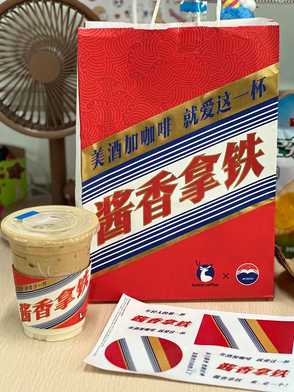 从一些已经购买酱香拿铁的消费者晒出的图片可以看到,杯套和纸袋上都有非常明显的茅台风格,上面标注着:“中国人的第一杯酱香拿铁”和“美酒加咖啡,就爱这一杯”。