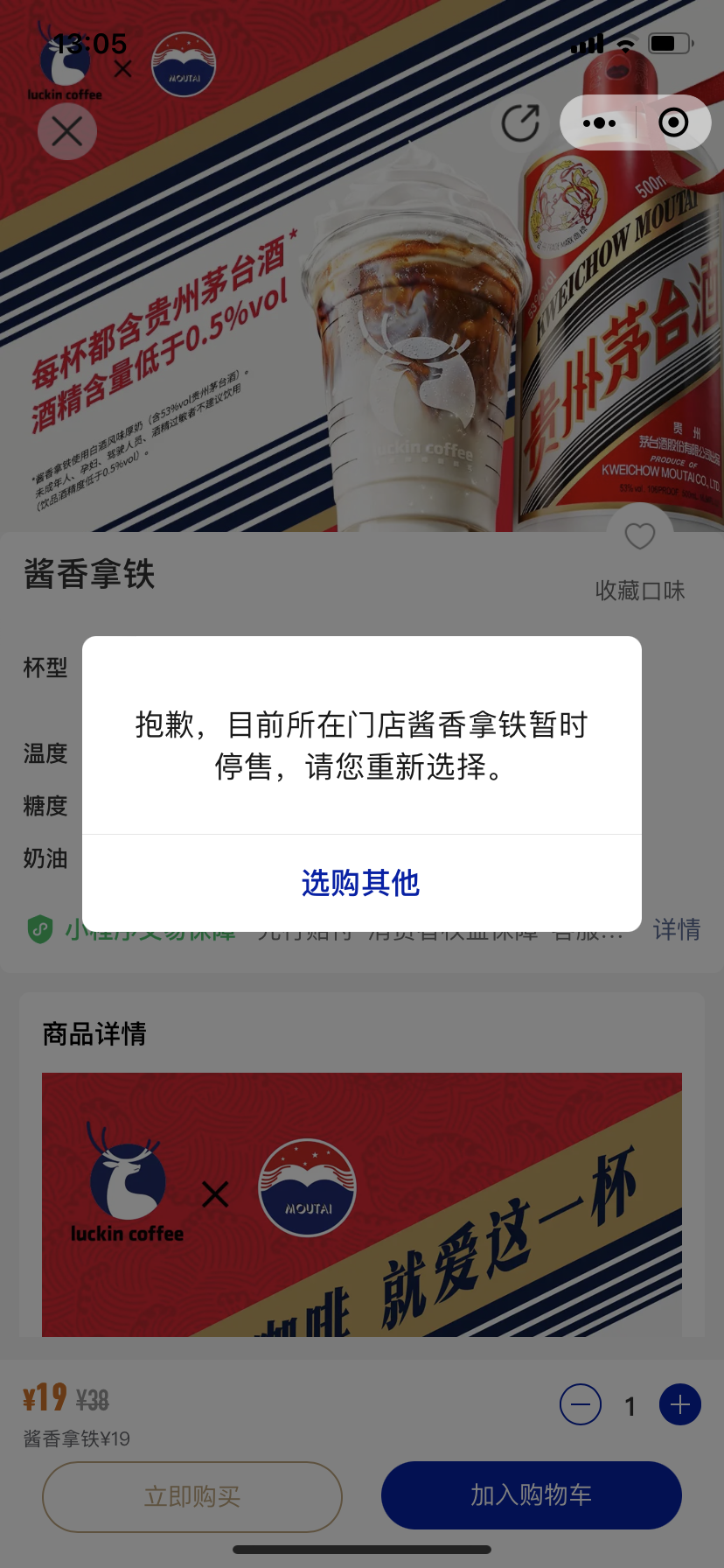 但不管怎么说,这款酱香咖啡在上架后,还是引起了一番哄抢。从小程序上看,不少门店显示酱香拿铁已经售罄。