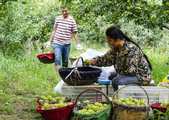 农民试采摘库尔勒香梨,他们分工明确,有的摘、有的装,很快香梨就装满了一筐又一筐。(图/中新网)