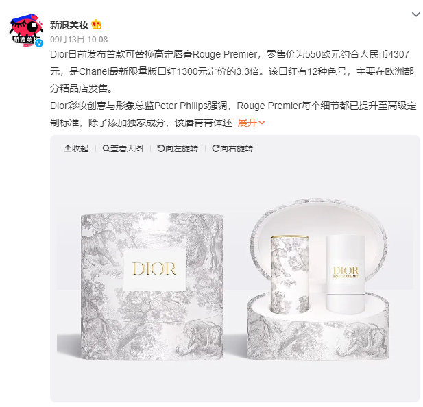 9月13日,微博话题#你会花4300元买一支口红吗#登上热搜榜。据了解,迪奥Dior于今年8月发布了首款可替换高定唇膏Rouge Premier,零售价为550欧元约合人民币4307元,是香奈儿最新限量版口红1300元定价的3.3倍。商品含一个陶瓷外壳+可替换口红内芯,有12种色号,主要在欧洲部分精品店发售。
