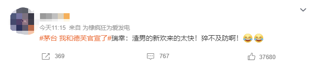 登上微博可以发现,热搜第一的“#茅台我和德芙官宣了#”的下面,紧跟着的就是热搜话题第二的“#茅台渣男#”。