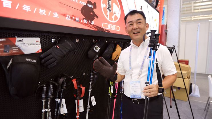图为日本滑雪装备大卖场Tanabe Sports公司负责人田邉昌博向观众介绍雪杖、手套等装备。(图/郑闻 摄)