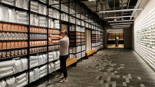 9月18日,在江苏昆山的星巴克中国咖啡创新产业园,工作人员在整理咖啡豆陈列架。(图/新华社)