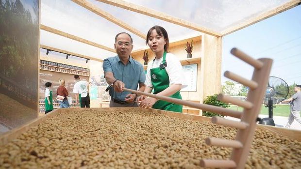 在星巴克中国咖啡创新产业园开园仪式现场,来宾在体验晾晒咖啡生豆。(图/新华社)