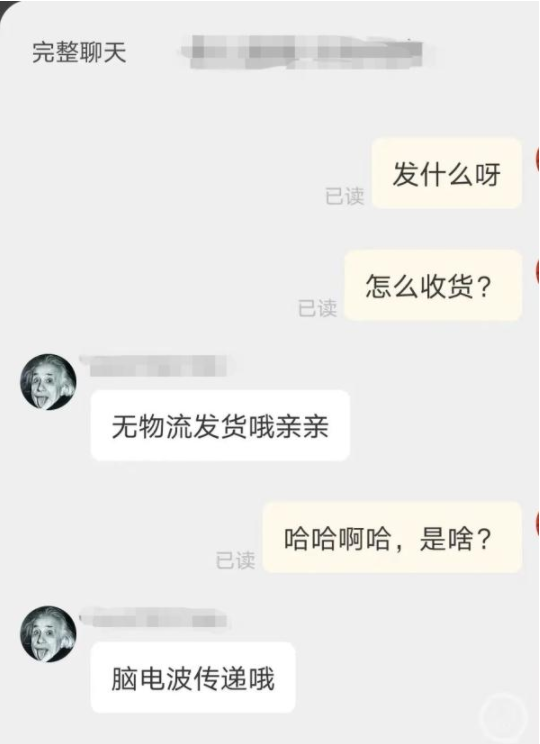 有一些“无厘头”卖家回复也很“抓马”:拍下半小时发货,发货之后,“爱因斯坦大脑”即可生效,立即长在自己(买家)大脑上。这名卖家还表示,拍下为无物流发货,脑电波传递,传递过去的是爱因斯坦电波。同时,还发来一句话:“接下来的人生就像开挂了一般,一切蒸蒸日上,非常成功和顺利。”