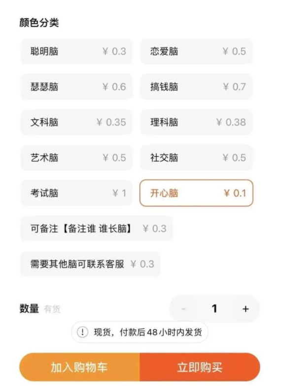 而除了“爱因斯坦的脑子”,“卖脑子”界还有不少“明星产品”。像有的商家还会售卖聪明脑、开心脑、考试脑、恋爱脑、搞钱脑……商品下方还做了提示“可以备注给某某长脑,需要其他脑请联系客服。”