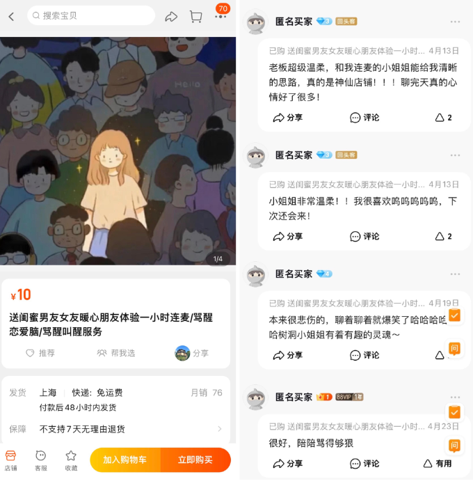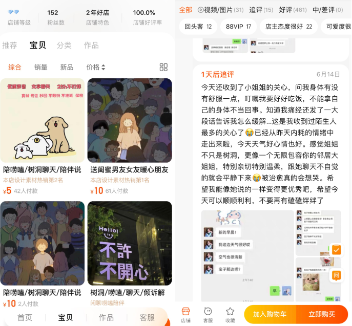 图为有店铺售卖“树洞倾听”服务及买家评论。(图/中国网络购物平台“淘宝”截图)