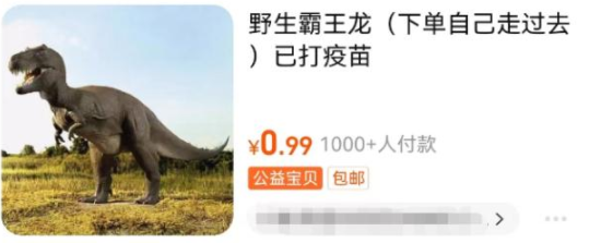 还有的店铺会出售“野生大象”“野生霸王龙”等商品,标注“野生霸王龙,已打疫苗,下单后会按地址自己走过去”“野生大象,会撒娇,拍下后大象按地址走过去”……
