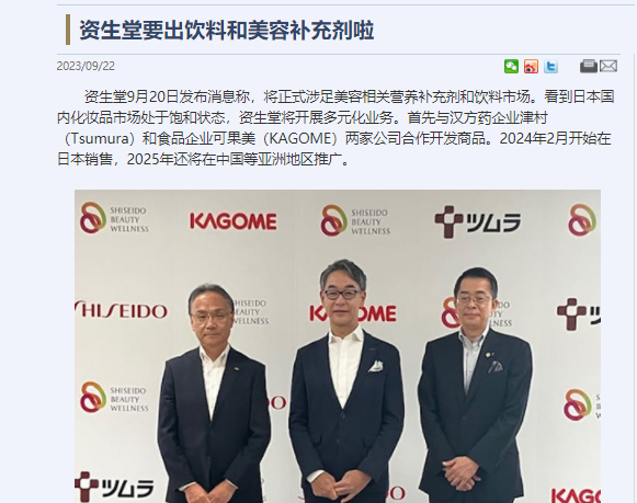 2024年资生堂将推出新品牌“SHISEIDO BEAUTY WELLNESS”。正考虑利用津村的汉方药相关知识,合作开发营养补充剂;利用可果美的蔬菜相关技术,合作开发饮料。商品将利用资生堂的销售网进行销售。打算以女性为中心开拓需求,并与其他企业合作。
