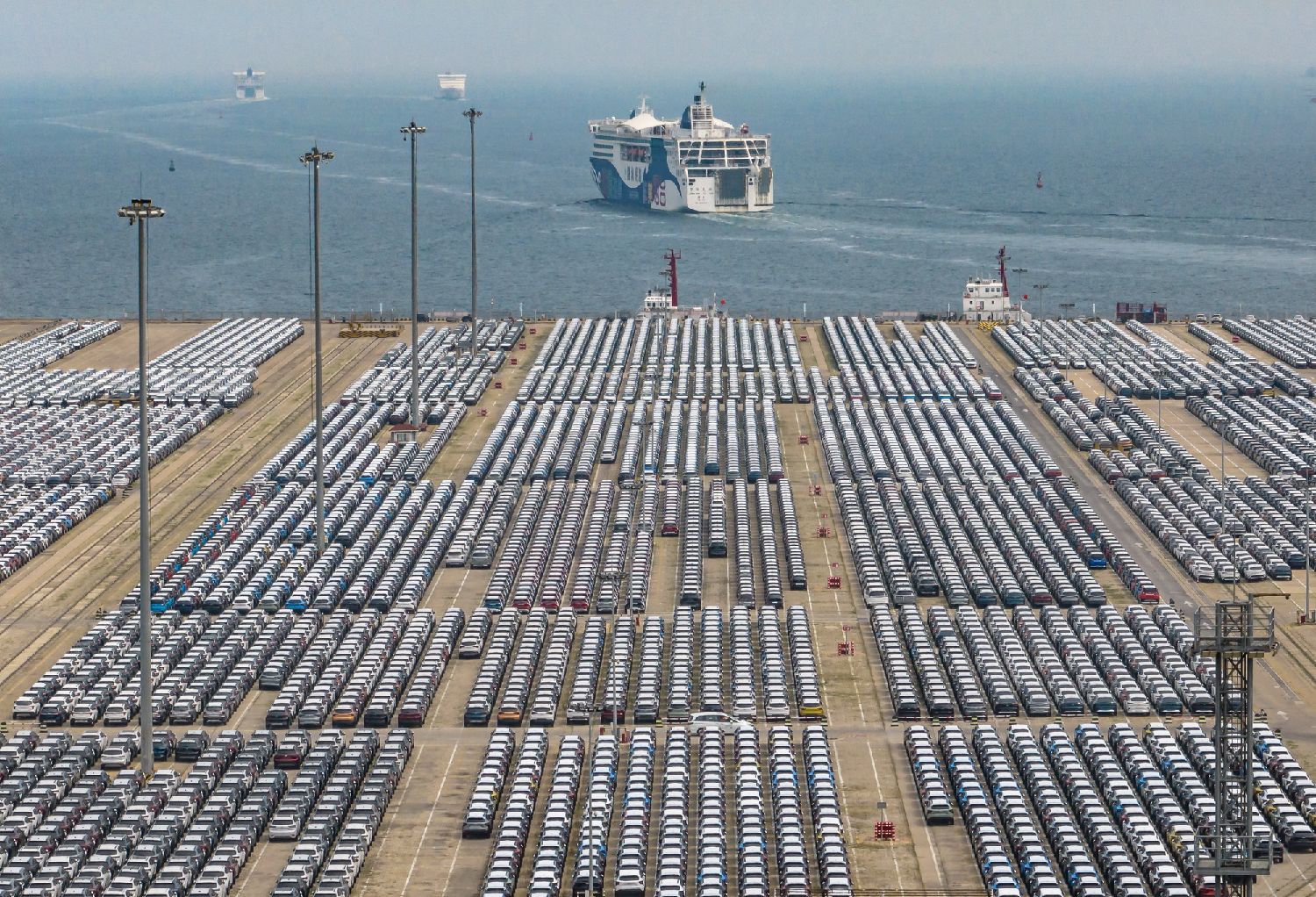 9月12日,在山东港口烟台港汽车码头,大批出口商品车等待装船发运。(图/新华社)