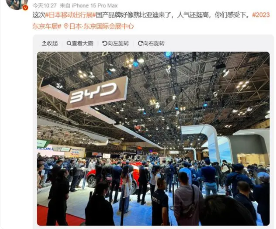 图为有网民分享在车展现场,比亚迪展台人满为患。(图/微博截图)
