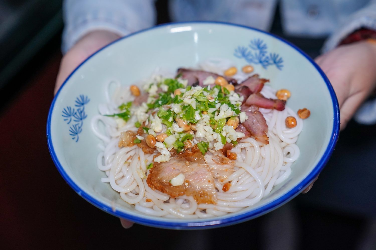 文晶说:“新鲜的米粉只需在热水锅里再‘冒’上10秒钟,铺上锅烧、轻浇上一小勺秘制卤水,撒上香葱、炸黄豆、酸豆角和辣椒等,一碗香气腾腾的米粉就出炉了。”