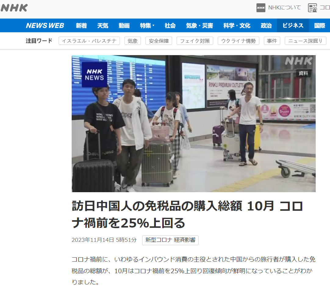 NHK14日报道,根据为包括日本在内的全世界40多个国家和地区提供免税服务的“Global Blue”公司的数据显示,今年10月中国访日游客通过国内商家购买的免税品总额,比2019年同期增加了25%。从8月开始,增加的态势更为显著。增速自9月以来不断扩大,呈现出明显的复苏态势。