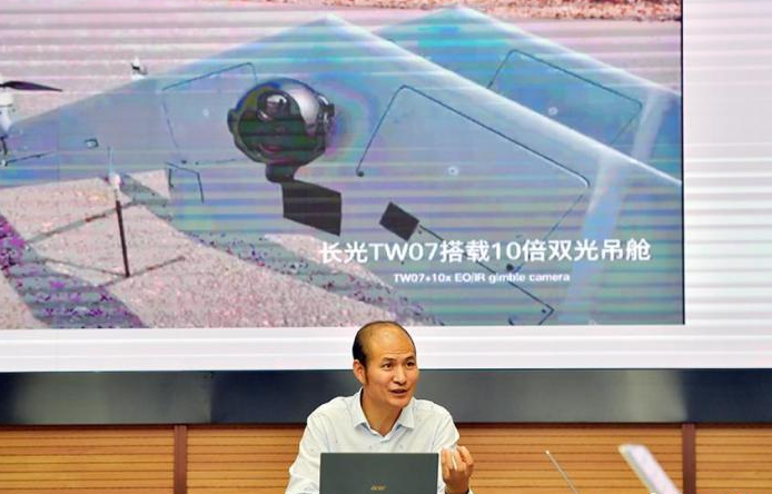 白越介绍双飞翼垂直起降固定翼无人机情况。(图/中新网)