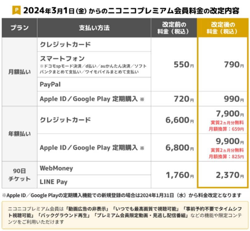 在调价后,niconico高级会员月费价格由550日元涨至790日元,年度价格由6600日元涨价至7900日元。