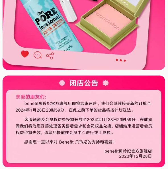 贝玲妃旗舰店闭店公告。(图/贝玲妃旗舰店截图)