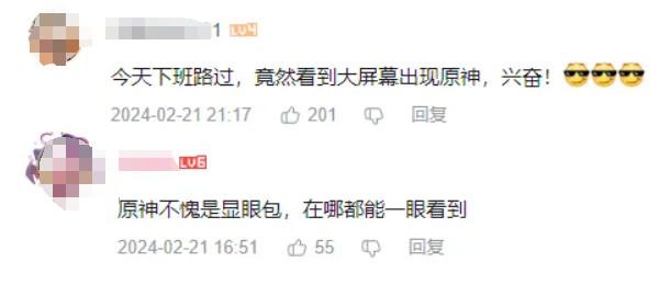 “今天下班路过,竟然看到大屏幕出现原神,兴奋!”