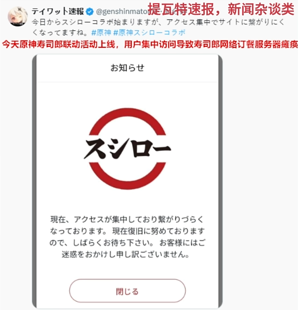 值得一提的是,这次联动一上线,太多用户挤入寿司郎网上订餐网站,还一度造成了网络瘫痪,不得不说原神的联动威力真的太大了……