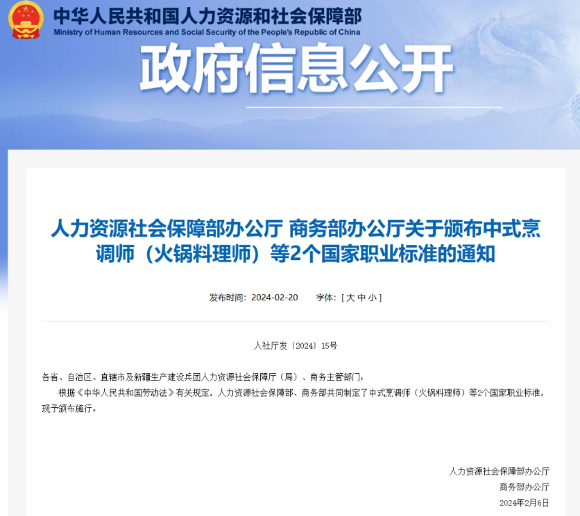 火锅料理师国标颁布。(图/中国人社部官网截图)