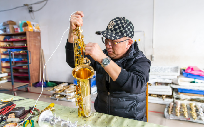 萨克斯、圆号、长笛……在村中最大的乐器厂“奥维斯”,工人们正紧锣密鼓地加工着各类乐器,涵盖定型、抛光、焊接、组装、调试、打包等各个工序。