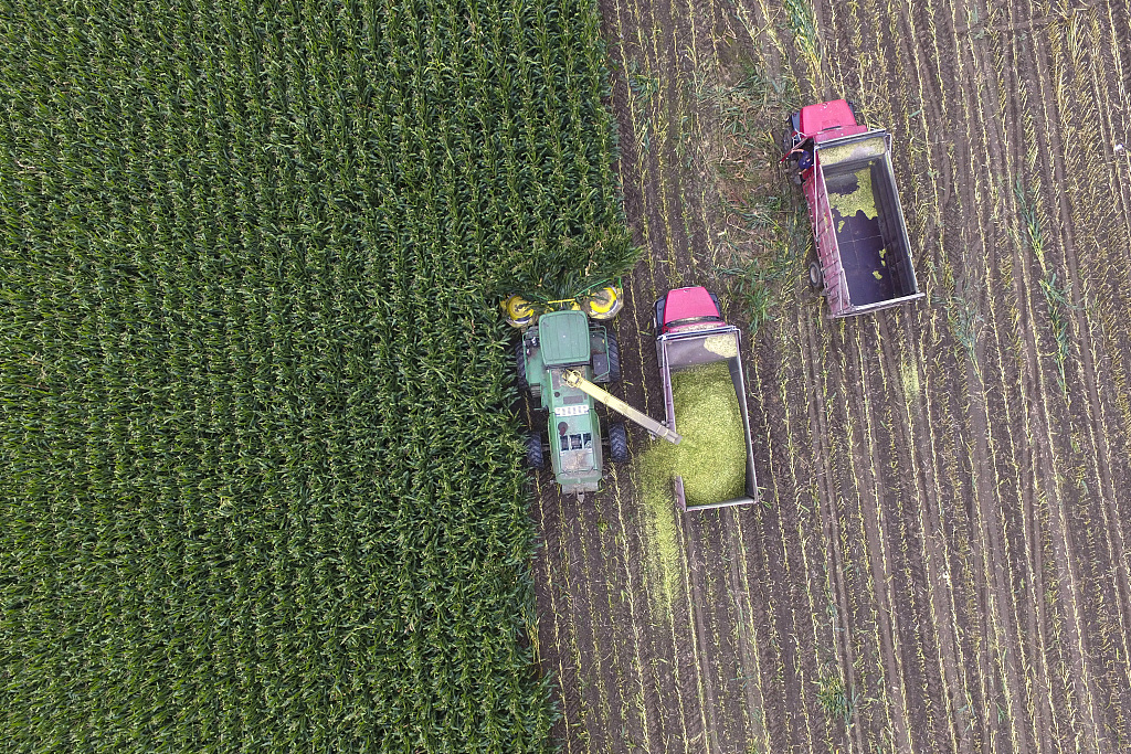 图为去年秋季,美国佛蒙特州农民们在田地里收获玉米的场景。(视觉中国)