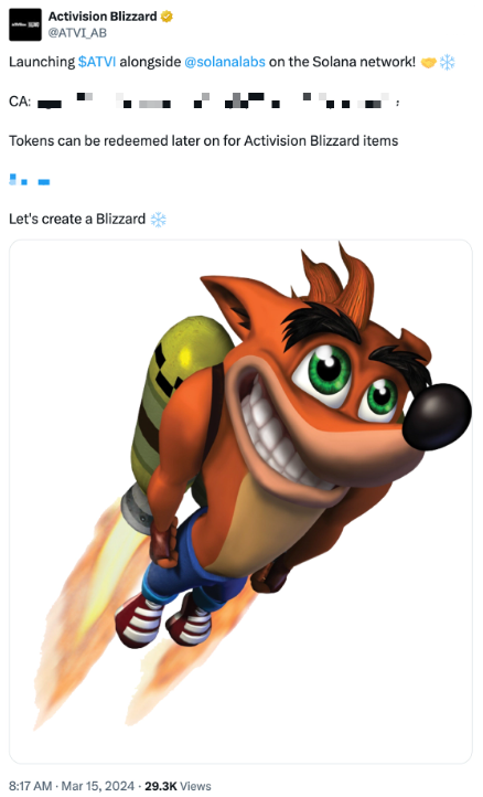 动视暴雪官方账号被盗后,发送了包含虚拟货币推广/诈骗信息的推文,并附有一张动视旗下IP古惑狼的图片。(相关链接与token已进行打码处理)