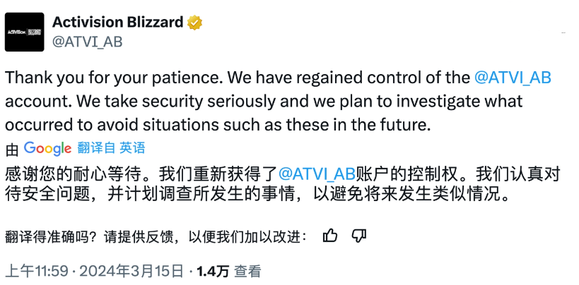 动视暴雪于北京时间15日中午发布推文,感谢玩家的耐心等待,表示已经重新取得账号控制权,官方十分重视安全问题,并计划进行调查,以避免类似事件再次发生。