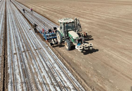 在第一师阿拉尔市,棉花套种孜然机械化播种工作正在展开。(图/中新网)