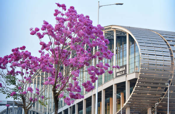 盛放的紫花风铃木与广交会展馆相映衬。(图/《广州日报》)