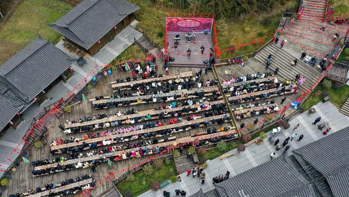 游客在百里杜鹃管理区普底乡参加长桌宴活动。(图/中新网)