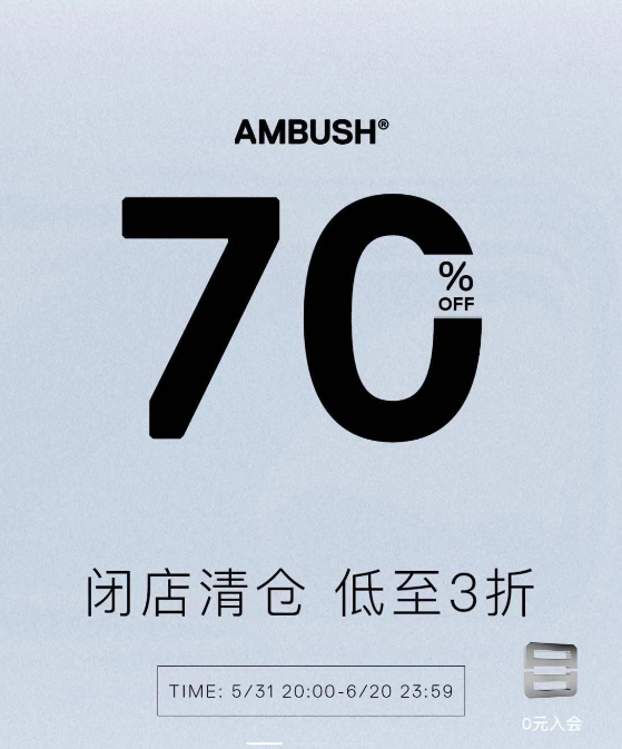 “闭店清仓,低至3折”,这是潮流品牌Ambush在天猫旗舰店发出的公告声明内容。根据该店客服人员的说法,Ambush天猫旗舰店自北京时间6月20日24时起结束运营,现店铺已开启清仓折扣。