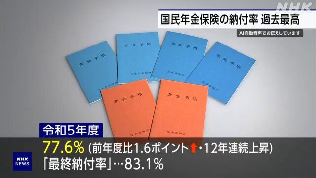 日本厚生劳动省于6月27日公布了自营职业者和学生等加入的国民年金在上个财政年度(令和5年度)的参保和缴费情况。根据公布的数据,国民年金的缴费率比前一年度增加了1.6个百分点,达到77.6%,连续12年上升,创下历史新高。包括后续补缴部分在内的最终缴费率也达到83.1%,同样创下历史新高。日本厚生劳动省和日本年金机构计划在未来五年内将最终缴费率提高到80%以上,并将继续加强相关措施。