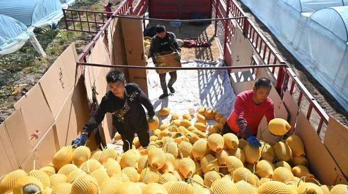 图为2023年10月,甘肃省酒泉市金塔县大庄子镇双新村蜜瓜喜获丰收。(图/中新网)